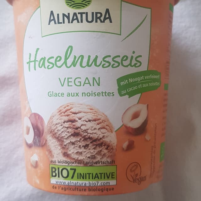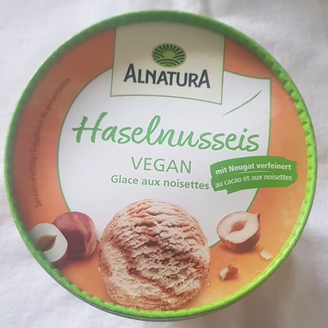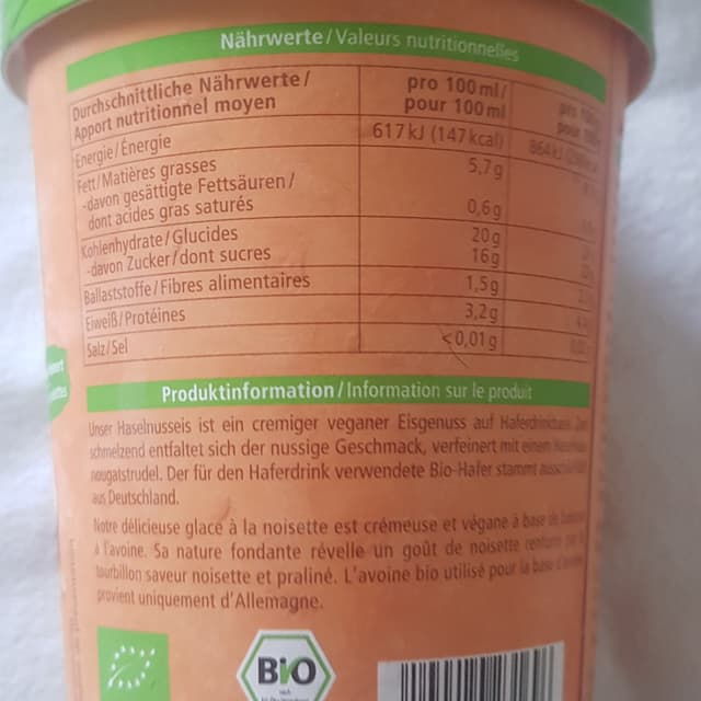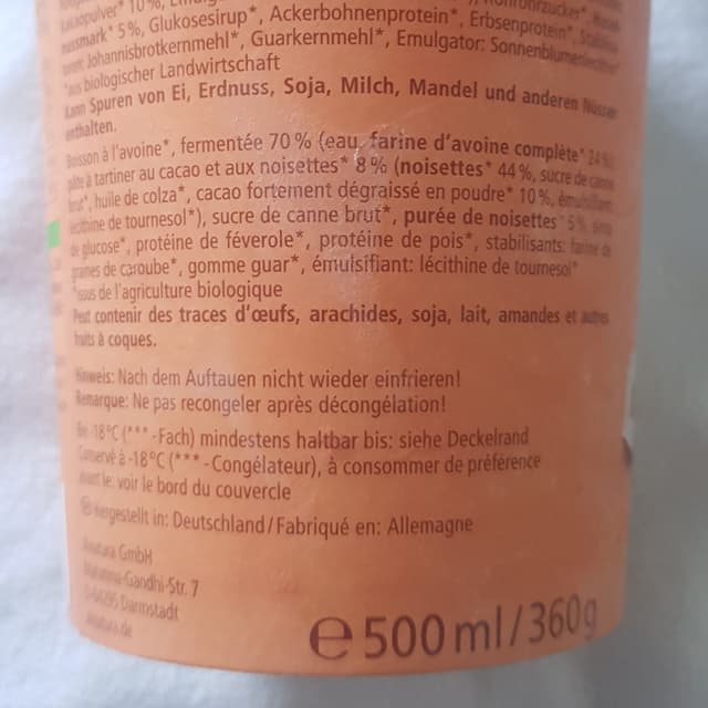 This is one of the few Vegan ice creams available in medium-small town France. I buy it frm Cora, which carries many Alnatura products. It is organic and less expensive than major brand non-organic dairy ice-cream). It is delicious and creamy, made from fermented German oat milk (fermented) and chocolate hazelnut spread (in delicious lumps). There's some rapeseed oil and sunflower lecithin in there too, along with pea and broad bean protein. Ok not so healthy at 20 percent carbs, 3 percent protein and 1 percent fibre, but it's a nice treat.