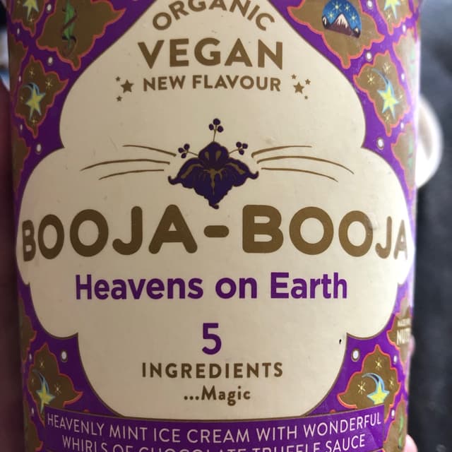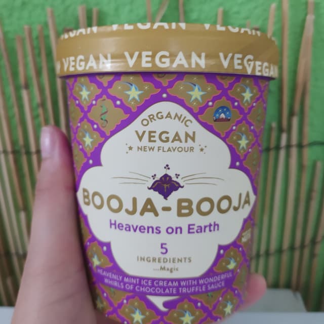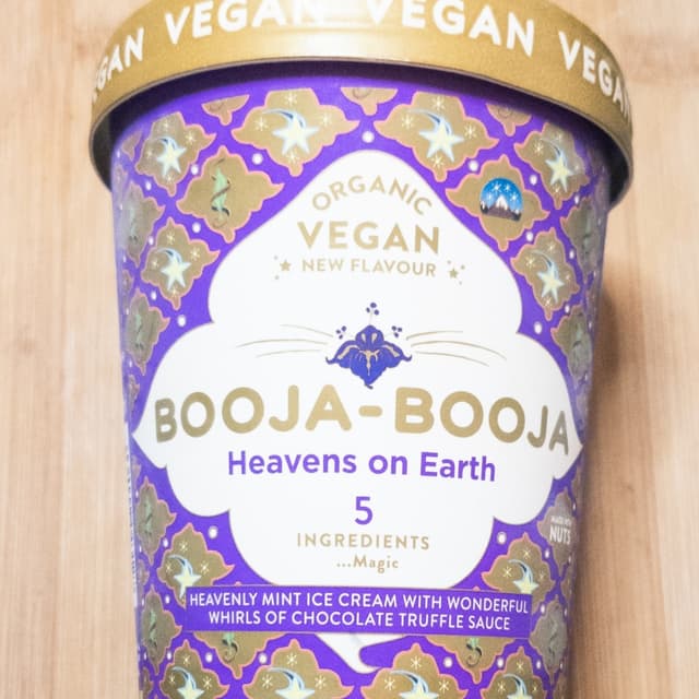5 ingredient mint chocolate ice-cream. Cardboard container. Could do with more chocolate but overall really nice. Like all Booja Booja products, on the pricier side but you pay for quality. Has the Vegan Society product certification.