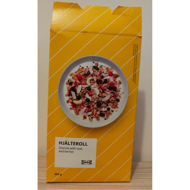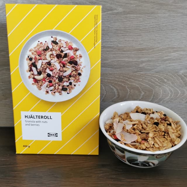 Hjälteroll Granola with nuts and berries Sehr positiv finde ich, dass dieses Müsli sehr knusprig ist! Außerdem enthält es extrem viele gesunde Zutaten, die den ganzen Mix wirklich sehr abwechslungsreich machen! Habe ich bei einem Müsli selten so erlebt! Weizenflocken, Vollkornweizenflocken, Kokos Raspeln, Vollkorn Haferflocken, Roggenflocken, Kürbiskerne, Cashew Nüsse, Haselnüsse, Mandeln, Erdbeeren, Heidelbeeren, Brombeeren... Um nur einige Zutaten zu nennen! Dieses Granola erhält meine vollste Empfehlung! 9/10 Wer das nächste Mal bei Ikea ist, sollte sich definitiv so eine Packung mitnehmen!