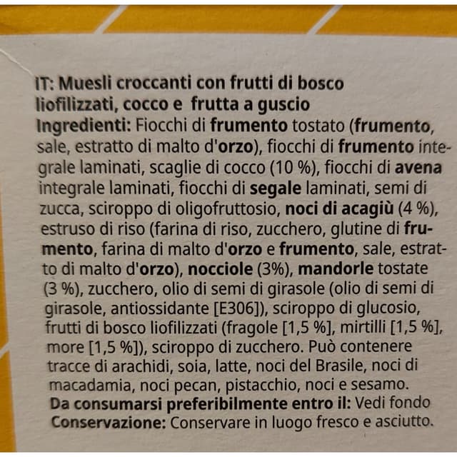 Granola di fiocchi di frumento tostato con scaglie di cocco, fiocchi di avena, semi di zucca, frutta secca mista e frutti di bosco. Il sapore che prevale un po' di più è quello dei frutti di bosco, che io trovo un po' aciduli. La granola non è dolce come altre che ho provato, diciamo che il tutto ha un sapore molto naturale. Nel complesso mi è piaciuto.