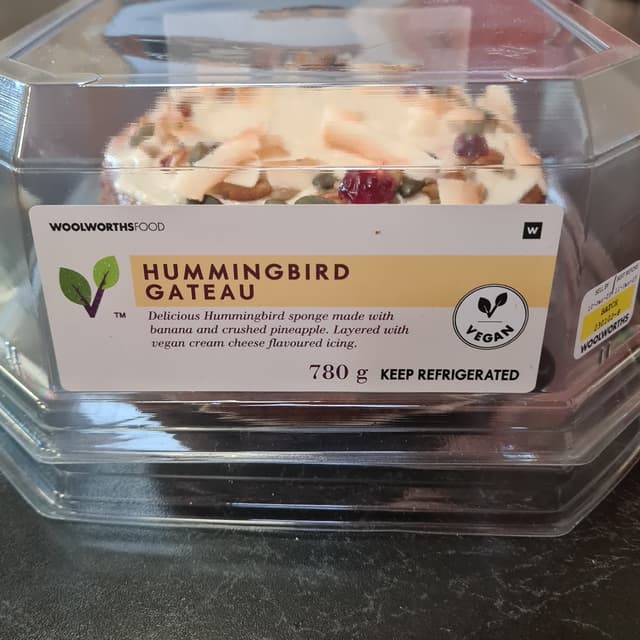 Pretty and delicious, woolies have outdone themselves. Topped with cranberries, coconut flakes and pumpkin seeds with a centre and top layer of cream cheese. The cake is soft and moist. The banana and pineapple are prominent and give an almost velvety taste. The cream cheese could not have been nicer and puts this cake in a class of its own. It is worth the R207 and I will buy it again. #vegancake