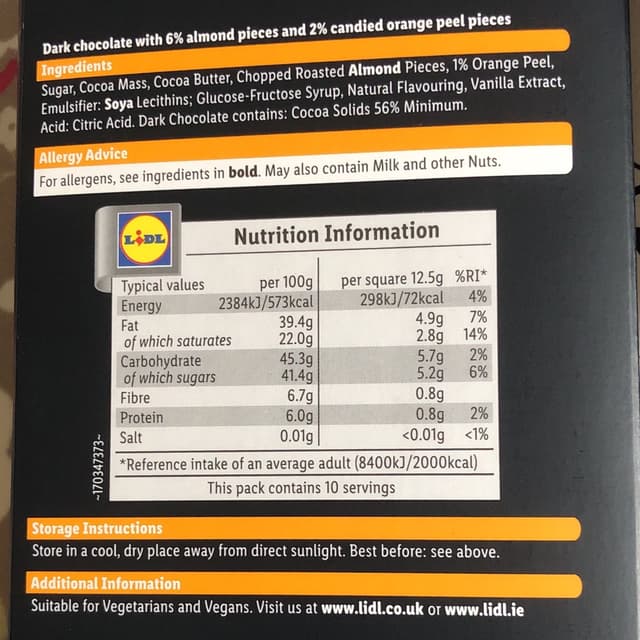 ele22 years agoSee TranslationThis is very delicious chocolate with plenty almond pieces and a natural orange flavour Unlike similar chocolate from other supermarkets, this bar is marked ‘Vegan’. This makes life so much easier! Will definitely get it again.0