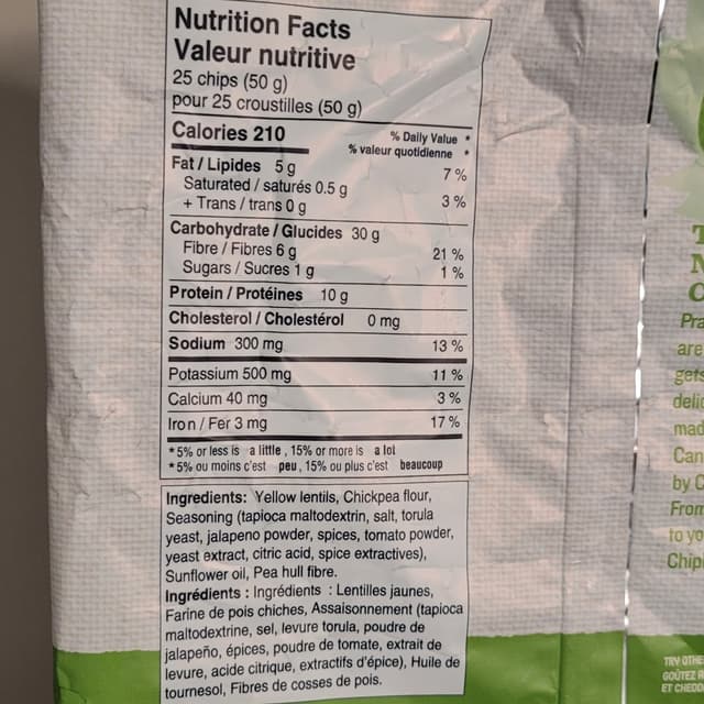 I wanted to love this chip but the flavour is so mild. It barely tastes like Jalapeño and is missing a strong savoury flavour. It's a thick chip which is interesting/different. 10g of protein per serving (chickpea & lentil based!), non-gmo, gluten free, baked, and made in Canada! If the flavour were better, this would be a home run. I would try a different flavour from this brand to see if I liked it better because this checks all the other boxes.