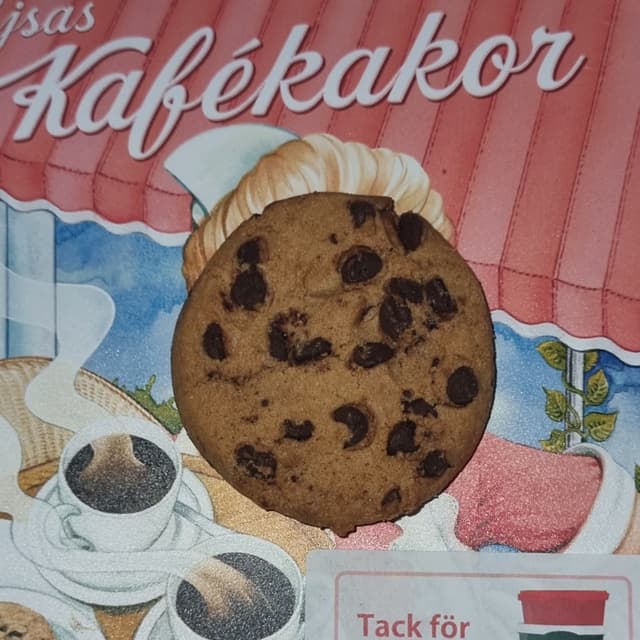 This is from Kakservice, aka a service where school classes, sport teams etc. Sell to people and collect money for their class/team/etc. My younger half-brother was selling cookies to collect money for his school class so I definitely needed to buy to support him. They're a bit expensive but it's for a good cause, in this case so that my brother's class can do something fun. I was pleasently surprised that they had 6 vegan options! I bought 4 of the vegan options but there were also a box with gingerbread houses and a box with vegan sour candy. These are also chocolate chip cookies but different from the ones in the blue box. They're bigger but also they don't have that sweet vanilla hint to it, but these are more like regular chocolate chip cookies.