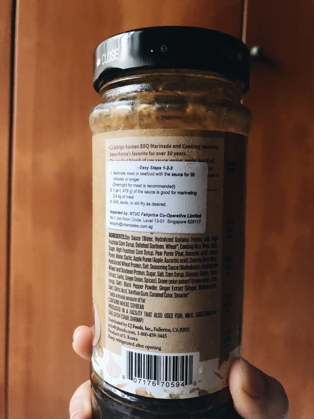 soy sauce (water, hydrolyzed soybean protein, salt, high fructose corn syrup, defatted soybean, wheat, cooking rice wine, koji), sugar, high fructose corn syrup, pear puree (pear, ascorbic acid), onion puree, water, garlic, apple puree (apple, ascorbic acid), cooking rice wine, hydrolyzed wheat protein, salt, seasoning sauce (maltodextrin, hydrolyzed wheat and soybean protein, sugar, salt, corn syrup, glucose, onion, yeast extract, garlic, green onion, spices), green onion extract (green onion, corn syrup, salt), black pepper powder, ginger extract (ginger, maltodextrin, salt), citric acid, xanthan gum, caramel color, and sesame