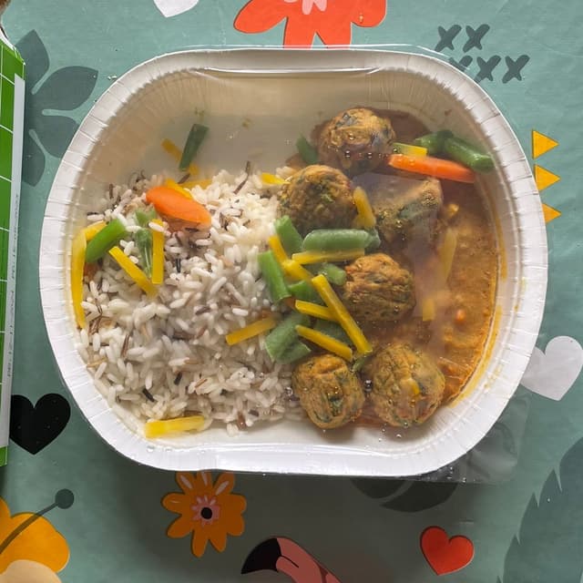 Polpette di verdure (ceci, carote, piselli, peperone, mais..) accompagnate da riso, verdure miste e salsa al curry (con latte di cocco, pomodoro, cipolla, zenzero, cardamomo, lime...). Piatto ben bilanciato, molto speziato, ricorda la cucina indiana. Servito in comode vaschette da mettere direttamente in forno. Non vedo l'ora di tornare da Ikea per riprenderle.