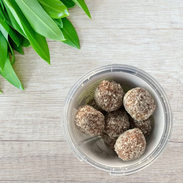 These are so fun! The lemon really pops in these energy balls, and the cashew paste is really creamy! The date, nut and coconut exterior are firm but have a nice yield when bitten into. Definitely a good snack for on the go. The recyclable container has a secure lid, so it can withstand some tossing.