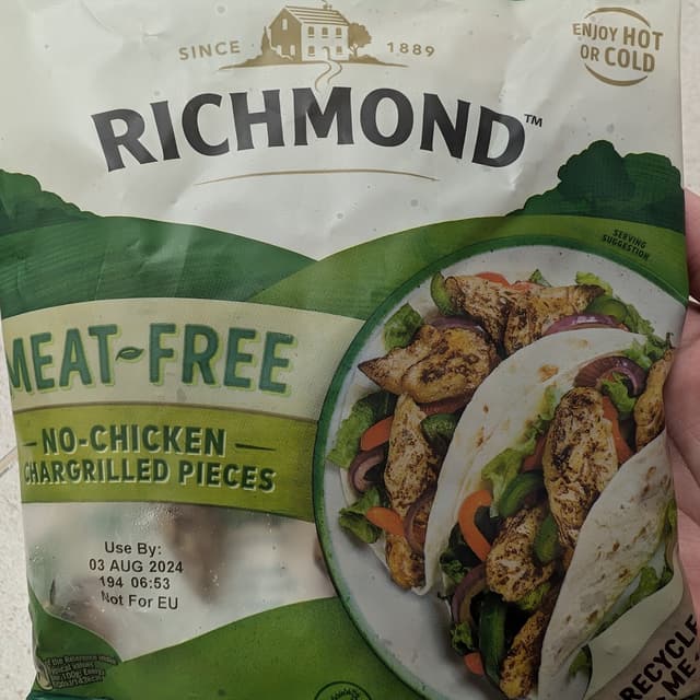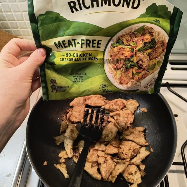 Very soft squidgy but tasty! Interesting bag container. I love the unique softness but also a smokey bitter charred to it. :3 tasty in my stir fry! 18/6/24 19:40 #richmond #veganrichmond #veganchicken #chicken #fakechicken #chargrilled