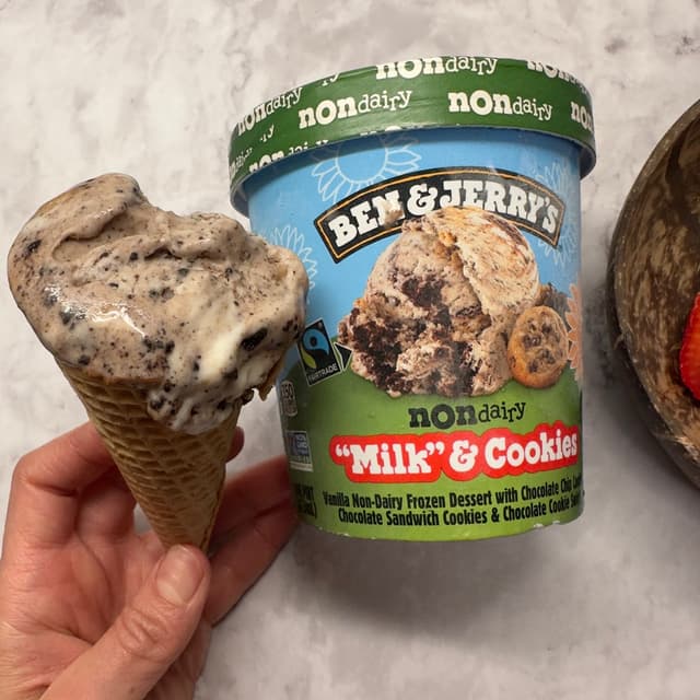 Introducing Milk & Cookies Non-Dairy Frozen Dessert - a delicious vegan treat that will satisfy your sweet cravings! This Ben and Jerry's classic is now available in a dairy-free, sunflower milk base with big chunks of Oreo cookies. Experience the creamy goodness of this frozen dessert packed with two types of cookie bits for an irresistible texture. Whether you're vegan or just looking to try something new, Milk & Cookies Non-Dairy Frozen Dessert is a must-try! Satisfy your sweet tooth without any guilt - grab a pint today and indulge in the perfect balance of creaminess and cookie chunks.
