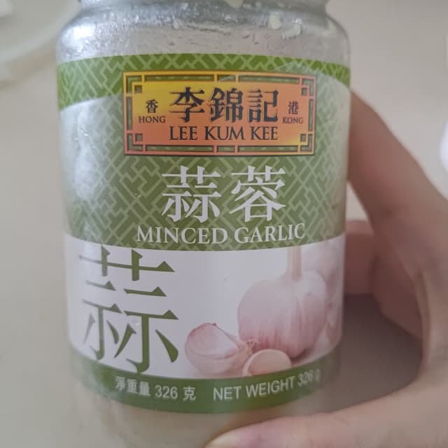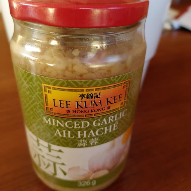 Vegan minced garlic useful for wok or any Asian dish. Very cool it's vegan. Glass jar. Fairly high priced: €2,69 at Dirk.