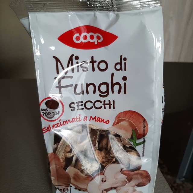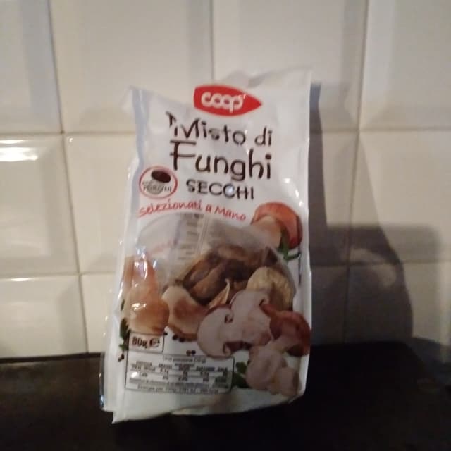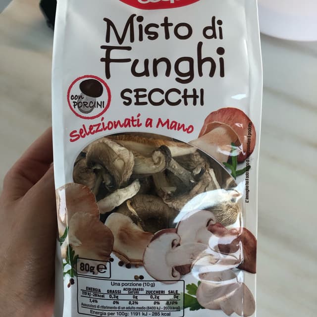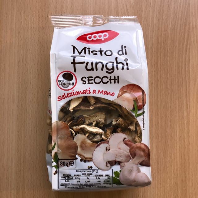 Misto di funghi di diverse varietà. Devono essere lasciati in ammollo per reidratarli per circa un paio d’ore. Il li ho usati per preparare un risotto ed è venuto perfetto! Acquistati alla Coop