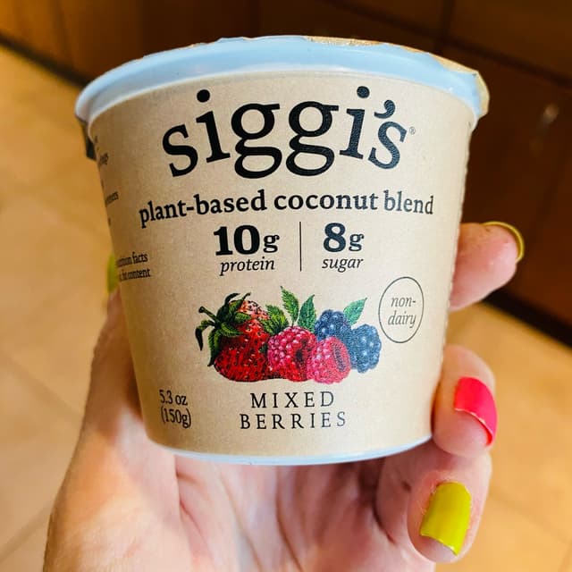 This yogurt is quite good! 🫐 🍓 It has a coconut base, which is my favorite for a yogurt. It is thick and creamy. Macadamia butter is also included which probably contributes to the rich and creamy texture. The added pea protein gives this yogurt 10 grams of protein (per 180 cals). I really like having the texture I love plus some protein - and I can’t actually detect any odd protein powder flavor in this. The berry flavor is lovely. It is not very strong but it is natural. This yogurt really is a great combo of the dreamy texture I want and the benefit of some protein. Unfortunately, it’s a bit pricier than other options. Going to keep me eyes out for sales 👀 2 for $4 at Sprouts (sale) #veganyogurt #berrylover #siggis #coconutyogurt
