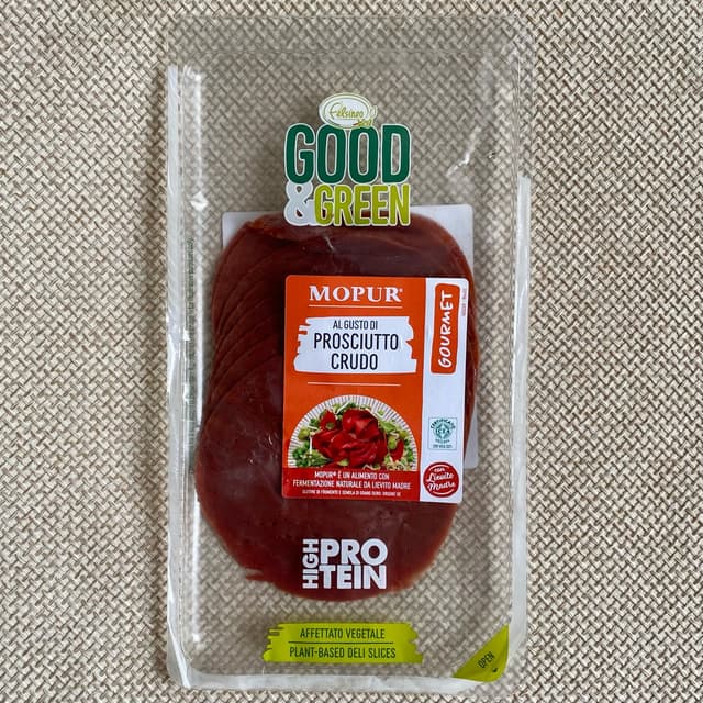 Mopur Gusto Prosciutto Crudo is a plant-based meat alternative that is designed to mimic the taste and texture of real prosciutto crudo. It is made from a combination of plant-based ingredients and is a healthy and delicious option for those looking to reduce their meat consumption. The savory flavor and chewy texture of Mopur Gusto Prosciutto Crudo make it a great choice for sandwiches or as an appetizer at gatherings. With its realistic taste and texture, it's hard to tell the difference between this meat alternative and the real thing.