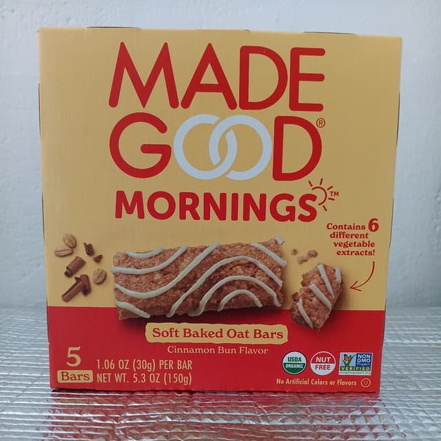 #vegan #veganisnotscary #madegood #cinnamonbun #organic #nutfree #madeincanada #highinvitamina #highinvitaminc #highinvitamind #highinvitamine #highinthiamine #nongmo #nongmocertified #glutenfree It’s been a while since I’ve reviewed a Made Good product. And like all the others I’ve reviewed by this company, this one doesn’t disappoint! These Cinnamon Bun Flavour Soft Baked Oat Bars are indeed soft. They’re delicious and smell fresh. I love the taste and scent of cinnamon. Each bar provides a good chunk of your daily requirement of vitamins A, C, D and E, and thiamine, with a decent amount of fibre too. Many ingredients are organic, and I’m intrigued that some vegetables are part of the mix. I bought these bars at No Frills for $3.99. They were on sale. They used to be regularly priced at $5; now they’re about $6. Admittedly, I don’t think they represent good value at the regular price. But on sale, I’ll load up on them. I’ll continue buying them and supporting this Canadian company.