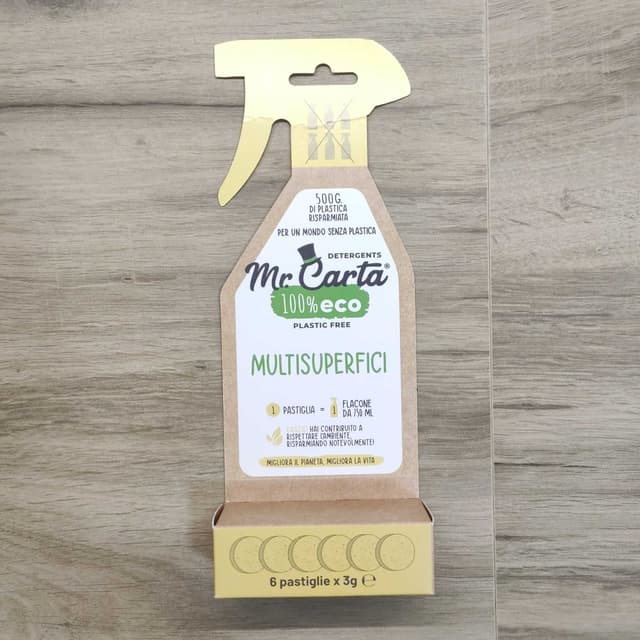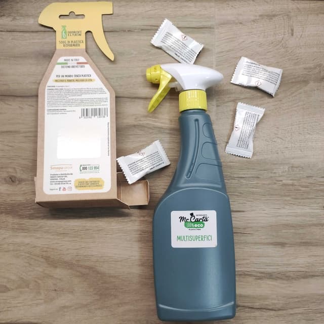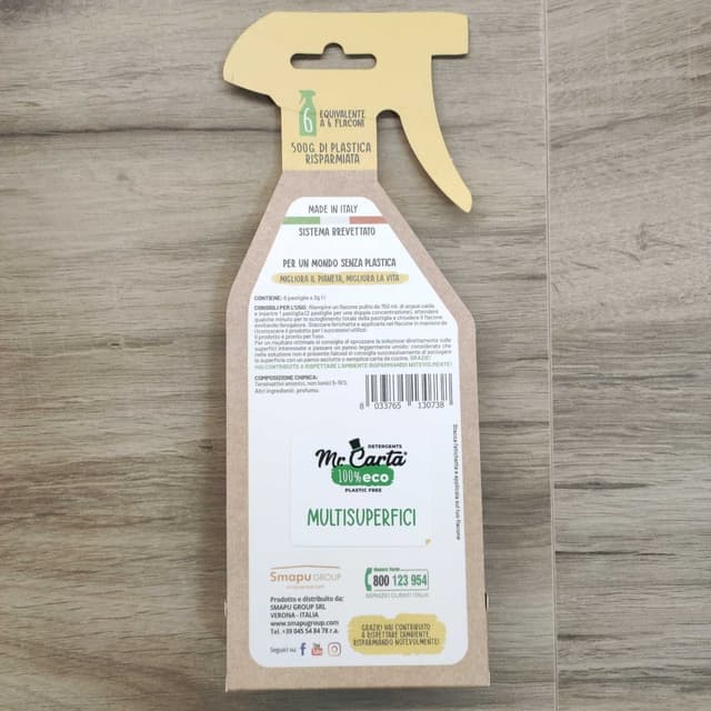 Prodotto per la casa ottimo, non specificatamente vegan. Composizione chimica: tensioattivi anionici, non anionici 5-15% - Altri ingredienti: profumo. Confezione totalmente in carta, da la possibilità di risparmiare sull'acquisto di 6 flaconi per la pulizia di multisuperfici evitando così di comprare tanta plastica.