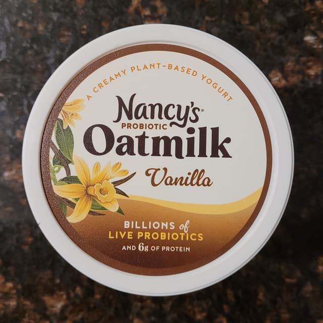 I wanted to get a yogurt that had a little more protein in it because some other brands only have a few grams per serving at most. This has 6g of #protein, 3g of #fiber, and 8g of #addedsugars. The texture is excellent. The flavor is ok, not spectacular but still fine. The #vanilla flavor isn't too strong so it would be great with some mix-ins like granola or fruit! #glutenfree #soyfree #nutfree and made with #oatmilk as clearly labeled on the front. Non-dairy yogurt cultures and #probiotic cultures are also labeled on the back with the ingredients.