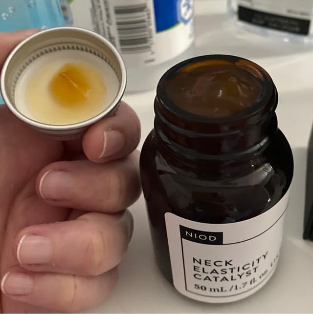 Been hearing about this product and reading reviews about how amazing it is for neck skin that’s starts to loosen with age. Picked up a container online with free shipping and it arrived within just a few days. Smell is a little strong (but nice) at first, but it dissipates within less than a minute. Extremely silky texture to this balm. Hoping to see great results, so far really enjoying it!