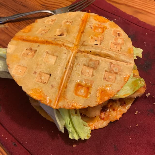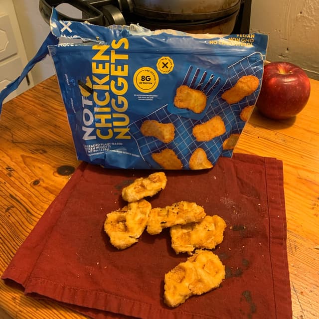 i prefer #nuggets to other forms of fake chicken. maybe because there is more surface area for coating/crispiness. i can cook five of these #chickennuggets in my waffle iron for a crispy not-chicken quesadilla sandwich, which are delicious. no chickens were abused in the making of this meal. #crueltyfree i need to get a traveling waffle iron.