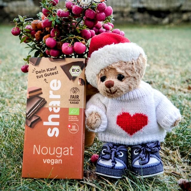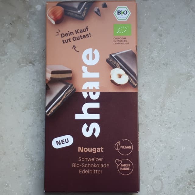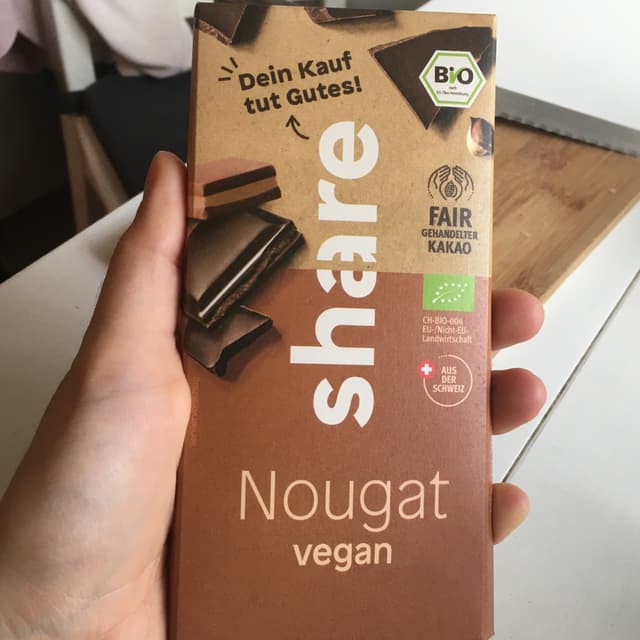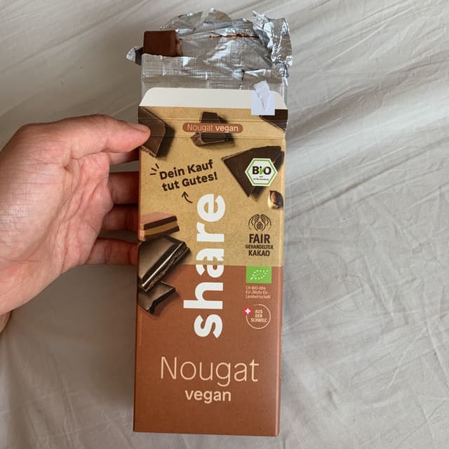 Super delicious vegan nougat chocolate from share. It's organic and fairtrade and I absolutely love it! Five stars ⭐⭐⭐⭐⭐