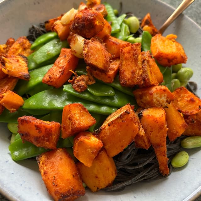 i made a portion of this black soybean spaghetti paired with some veggies and sauce. very filling & cooks fast, but i wasn’t too satisfied with the taste. it’s also gluten free & high in plant protein ✅
