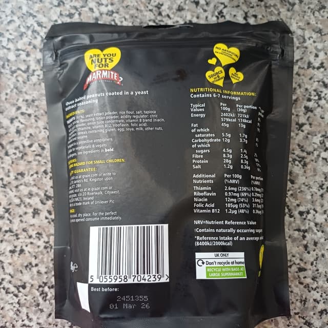 91% peanuts. Oven-baked. Coated in yeast extract, rice flour, and vitamin B blend (B12, niacin, folic acid). No added sugar. Low salt. No artificial preservatives. Crunchy texture. Strong umami flavour. Made in the UK 🇬🇧