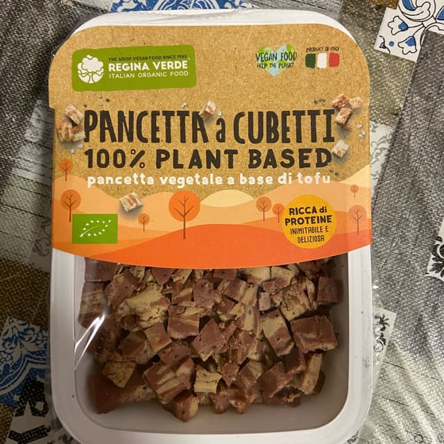 Pancetta vegetale a base di tofu 100% pant based. Ottima da abbinare ad un piatto di pasta come condimento. Imballaggio riciclabile plastica.