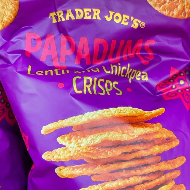 We love Indian food, so when I saw these lentil and chickpea papadum crisps at Trader Joe's I had to try them. We both really enjoyed these! They are super thin, light and crisp. I served them with some dal and mango chutney and they were fabulous 🤤 I will say though, that if you don't like cumin, these probably aren't going to be your favorite because they are fairly cumin heavy. #traderjoes #indianfood #glutenfree #papadum #snack #vegansnacks #crisps