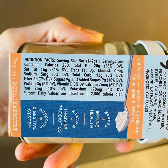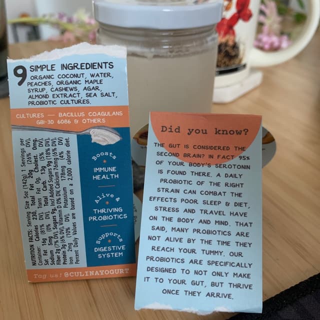 Culina is one of my favorite vegan yogurt brands for so many reasons! This flavor says “almond,” but it’s also coconut and cashew, which makes it so creamy and the flavor more complex. The texture and tartness are like a Greek yogurt. I also love the glass jar, and that they use cardboard instead of a sticker to label it, so it’s easily reusable 🥰 (They used to put their yogurts in mini plant pots, which was also cute.) It’s a little pricey, but it’s amazing quality! #veganuary 🍑