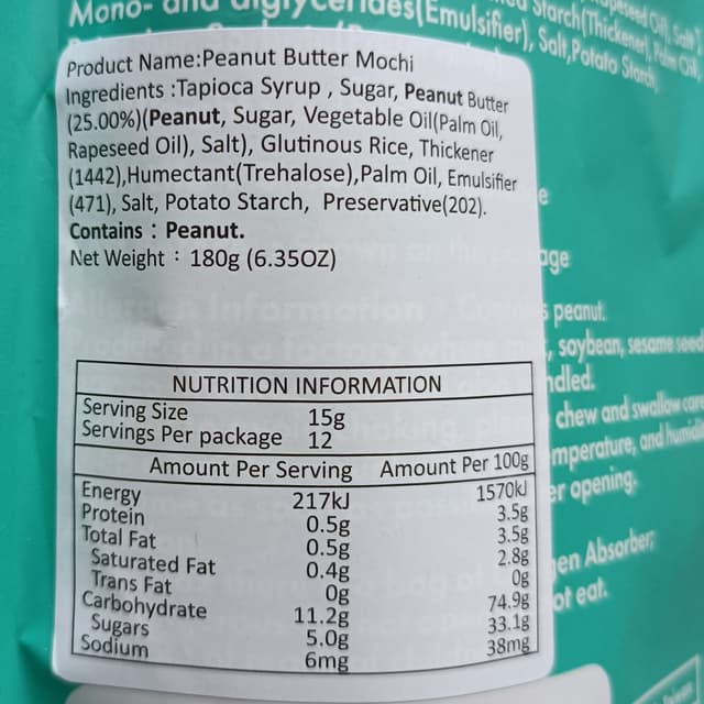 It's okay. Not enough peanut butter filling. Overpriced at R111.99 at Spar. Ingredients: tapioca syrup, sugar, 25% PEANUT butter (70% PEANUTS, sugar, vegetable oil margarine (palm, rapeseed), salt), 10% glutinous rice, *trehalose, starch, palm oil, emulsifier (E471), salt, potato starch, preservative (E202). *Trehalose is a source of glucose. Nutritional declaration. Average values per 100 g: Energy 1570 kJ / 380 kcal, Fat 3.5 g of which saturated fat 2.8 g, Carbohydrates 75 g of which sugars 33 g, Fiber 0 g, Protein 3.5 g, Salt 0.10 g.
