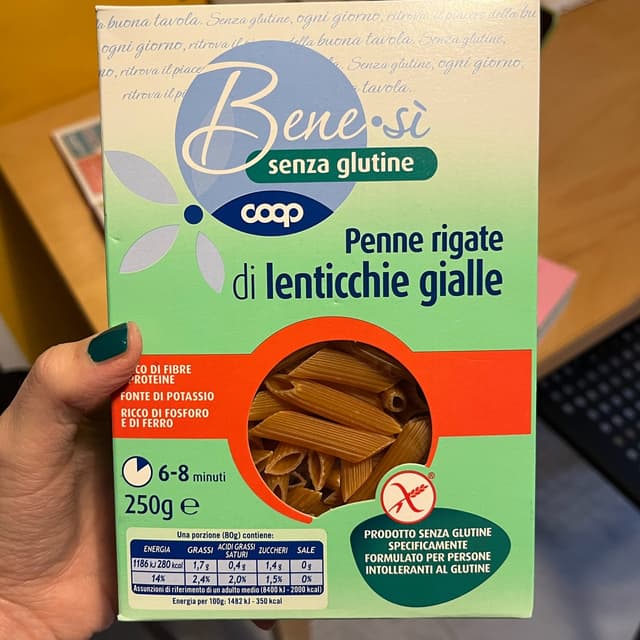 Confezione da 250 grammi di penne rigate realizzate esclusivamente con farina di lenticchie gialle.Ricche di fibre,proteine e sali minerali come ferro,fosforo e potassio.Trovo che questa pasta abbia un sapore molto delicato e abbastanza neutro inoltre diversamente da altre marche provate questa non si é spappolata durante la cottura.