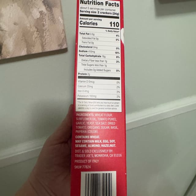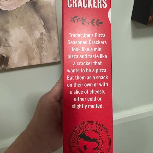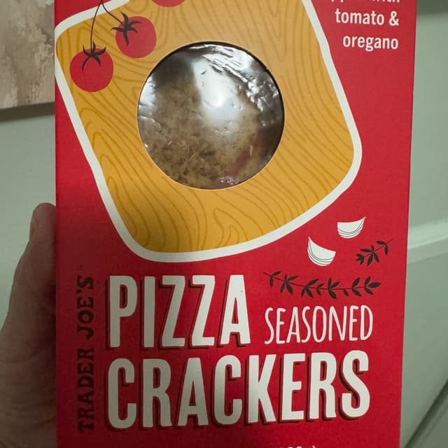 Big round crackers that taste and sort of look like a pizza! Tasty crunchy cracker topped with tomato and oregano. The oregano is on the strong side which I really enjoy. Addicting flavor and very good on its own. I’m sure it would be good with accompaniments as well. #traderjoes #pizza #crackers