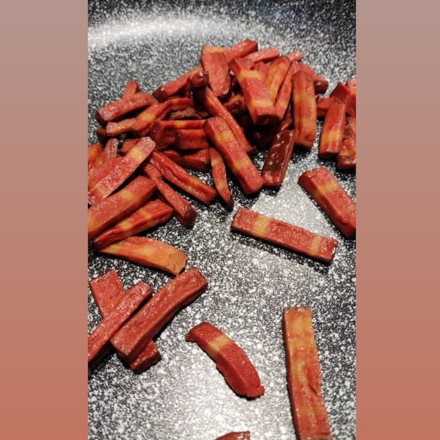 È un prodotto davvero stupefacente. Non amavo la pancetta da onnivora, non ho mai mangiata a tonnellate, ma devo dire che questo prodotto ha un sapore e una consistenza davvero molto simile alla pancetta passata in padella.
