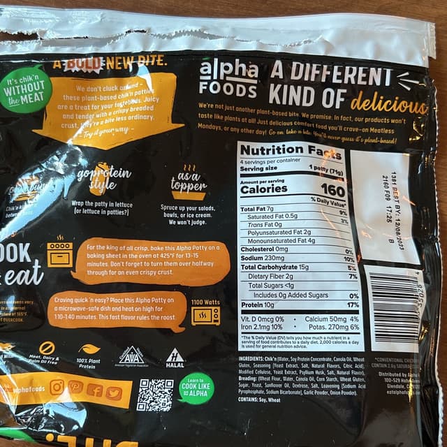 I found these breaded chick'n patties at the Grocery Outlet. Thought I'd give it a try as I had never seen this brand before. I air fryed the patties for about 10min or so and they turned out nice and crispy. I would say these are not as flavourful as other breaded chicken burger/patties I have tried, but this is still decent, especially at Outlet pricing. I ate it in a bun with a bunch of condiments/toppings and it tasted good overall with the additional flavors.