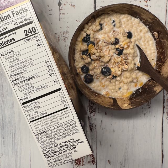 Very nice hearty muesli naturally sweetened by raisins! These would probably be a good addition to muffins or a baked oatmeal 🥣! I mixed with some quinoa puffs and enjoyed as a cereal with fresh blueberries 🫐 for a late night snack! Great source of #fiber and #protein! Iron too! $3.29 from Aldi #veganinillinois #muesli #cereal #breakfastfood #oats #vegan4life #vegan4theanimals #vegan4theplanet #abillionlove