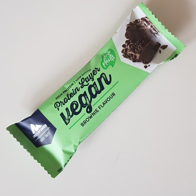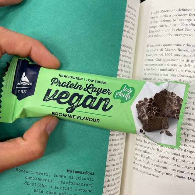 Barretta proteica vegana molto buona al gusto brownie 🍫 con proteine di soia, riso e piselli + cioccolato. Proteine 24% (13 g per barretta). Ottimo prodotto.