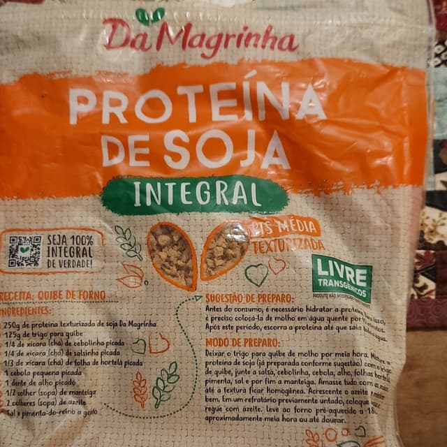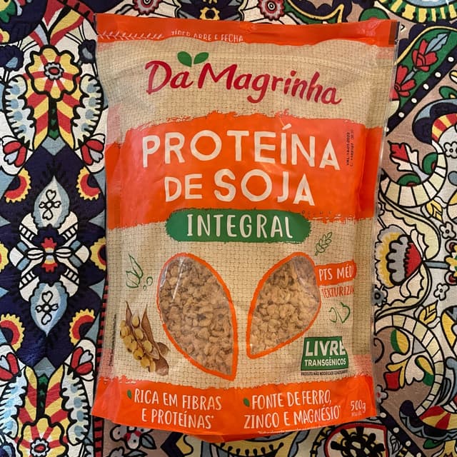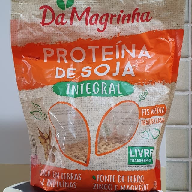Proteína de soja, textura média, coloração clara. Tem sabor suave. Indica não ser transgênico.