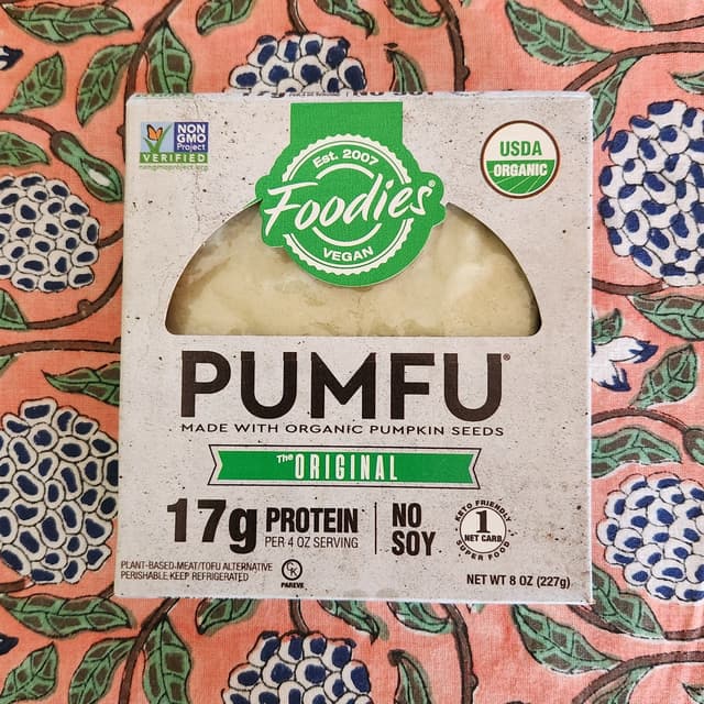 I am embarrassed to admit that this #pumfu has been sitting in the back of the fridge for many months. I think I was intimidated by something I can't really put my finger on. The pale green color? The sponge like appearance? Today I took it out as we scraped the bottom of the barrel in food supply due to a Wisconsin snow storm. Ready for a quick weekend lunch, l opened our nearly bare fridge. I stared at the pumfu, now two weeks expired. It stared back. Well it's phenomenal! No pressing required and ready to go. Extremely versatile and easy to prepare in multiple ways. Slightly denser than tofu and more like a vegan steak or porkless consistency. And the best part.. no weird taste! It has a slightly nutty flavor and that's it, opening up endless possibilities for healthy quick meals. Only downside is it's significantly pricier than tofu. #teampumfu