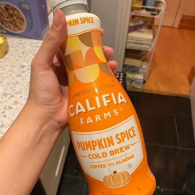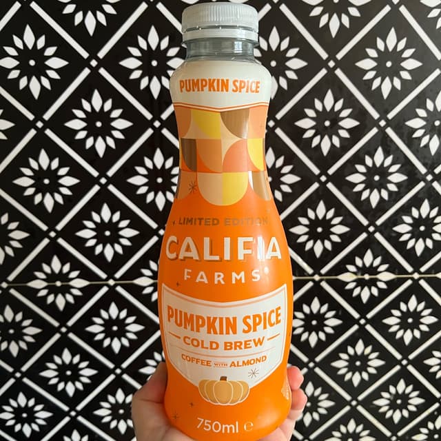 Califia Farms - Oatmilks, Almondmilks, Creamers, Coffees Limited Edition  pumpkin spice cold brew coffee with almond.  Your Pumpkin Spice Cold Brew is Ready Bold cold brew plus our velvety almond drink, real pumpkin and spices beautifully blended and ready to sip. Pour over ice and enjoy. Plant-Based Drink, 100% Arabica Coffee, BPA Free Packaging, Carrageenan Free, Always Plant-Based, Suitable for Vegans, Kosher Country of Origin Produce of the EU Suitable for vegetarians Seen this advertised on social media and thought i have to try and get some of this urgently.  so i was lucky enough to pick a couple up for 59p what a bargain,  how to drink - open bottle and pour into glass and drink straight great over ice even add some vodka - blinking delicious.  Love the opportunity to taste pumpkin ingredients food whether food or beverages and when i find them with £2 discount price the better.  So all this week i have been adding it into my coffee for a more luxurious flavour.  This milk can be drunk hot or cold but must be kept in the fridge so it does not spoil  after opening you have 7 - 10 days to use it up by.  10/10 review totally recommended for the fridge / cooler pantry for your plant based cooking and drinking you will be happy to buy.  #coffee #milk #almond #caffine #flavour #vegan #veganshopping #veganhaul #caffine #veganism #plantbased #drinks