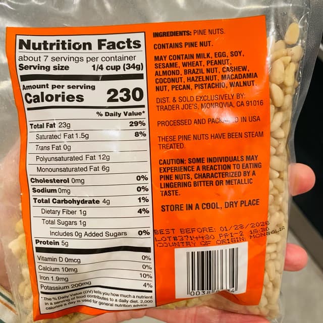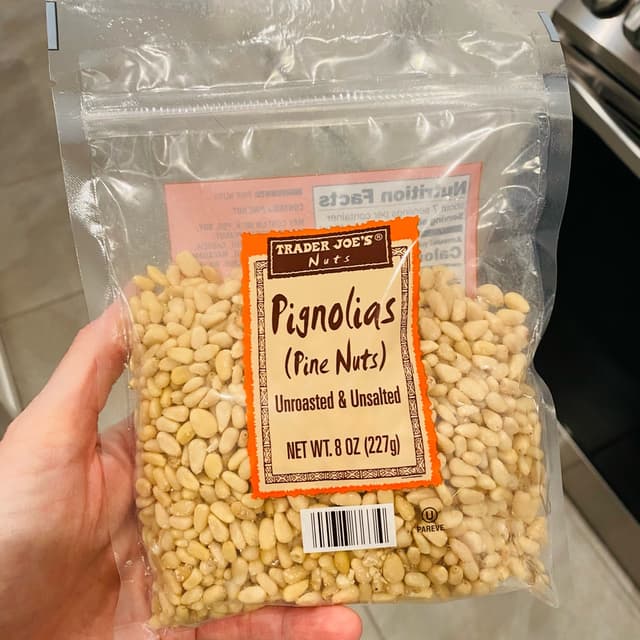 For my first time making pesto, I used TJ's pine nuts. I was pleasantly surprised that they carry pine nuts! I knew they had all the other ingredients I needed for my pasta and wasn't looking forward to making a stop at a second grocery store. These were fairly expensive, as expected. And unfortunately I used most of them in my recipe, I thought they'd last longer! I really like pine nuts for topping soups and salads, so I think I'll try to just keep them on hand, like pumpkin seeds.