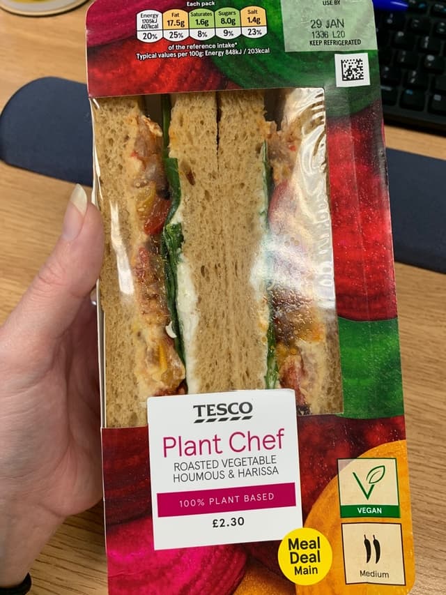 Nice enough vegan sandwich in Tesco’s £3 meal deal. It’s quite onion-y though! Marked vegan #veganisnotscary