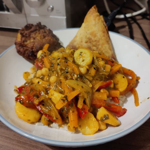 The spice is nice! Lots of flavours here. Mild not too hot. It’s creamy and works well with tofu and red pepper. The recipe suggests vegan mince, it’s also versatile. I love the smell of the all spice.