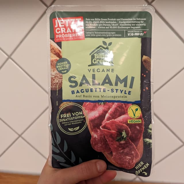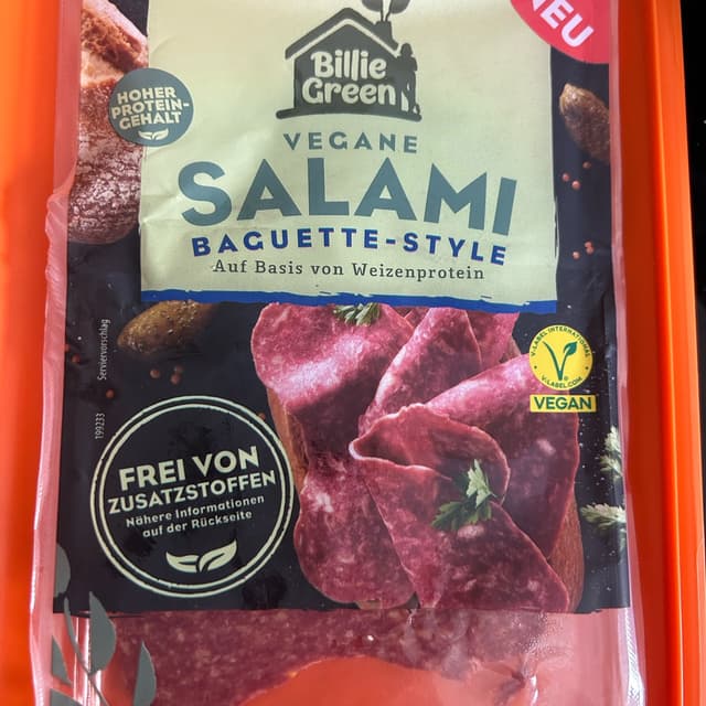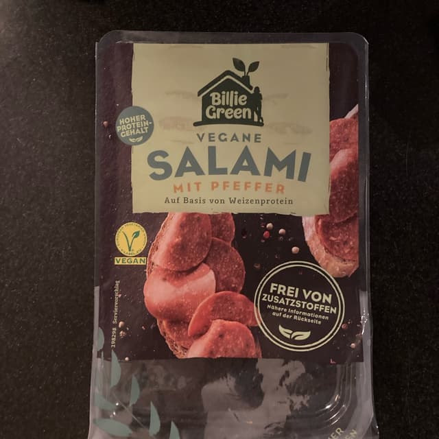 This is my favourite brand of vegan salami. The taste and texture is very true, but minus the pig corpse and all the microscopic leeches and microplastics. You can somewhat tell from the presentation that this isn't "real" salami, but the rich taste makes up for that. Billie Green - please come to the Netherlands too, your product is superior to our current vegan salamis by a mile!