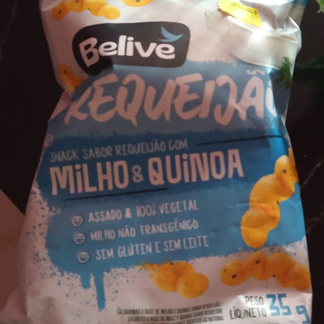 Salgadinho feito de milho, lentilha e quinoa, sabor requeijão. Cheirinho de salgadinho de requeijão tradicional; sabor muito bom e bem mais saudável!