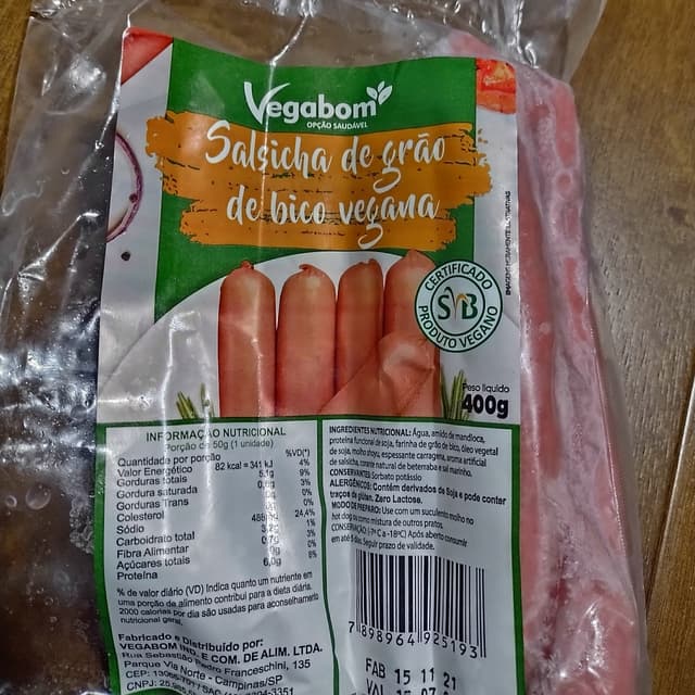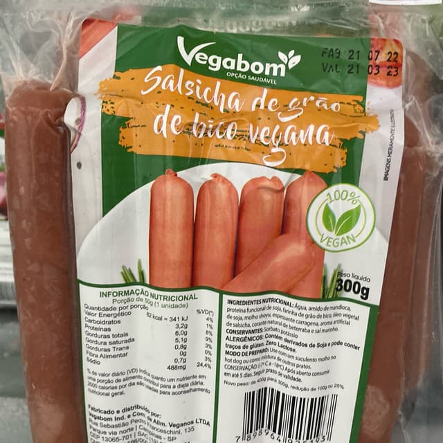 Salsicha de grão de bico. Deliciosa e com bom custo benefício.