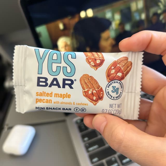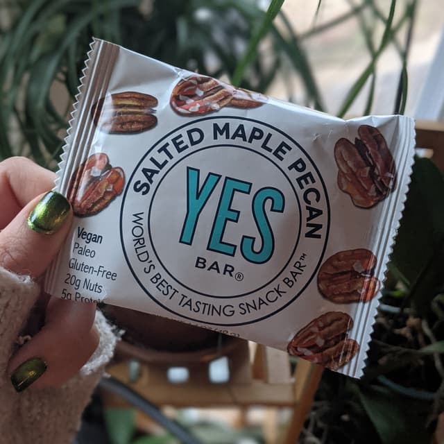 really liked this Salted Maple Pecan Yes Bar a lot better than i thought i would! i was expecting a protein bar, but i’m very happy that it’s more like a chewy granola bar! i love the variety mix of nuts (almonds, pecans, cashews, macadamia) that combine with the slight maple and cashew + coconut butters to create the perfect salty + sweet flavor! 🍁 #glutenfree #veganproud