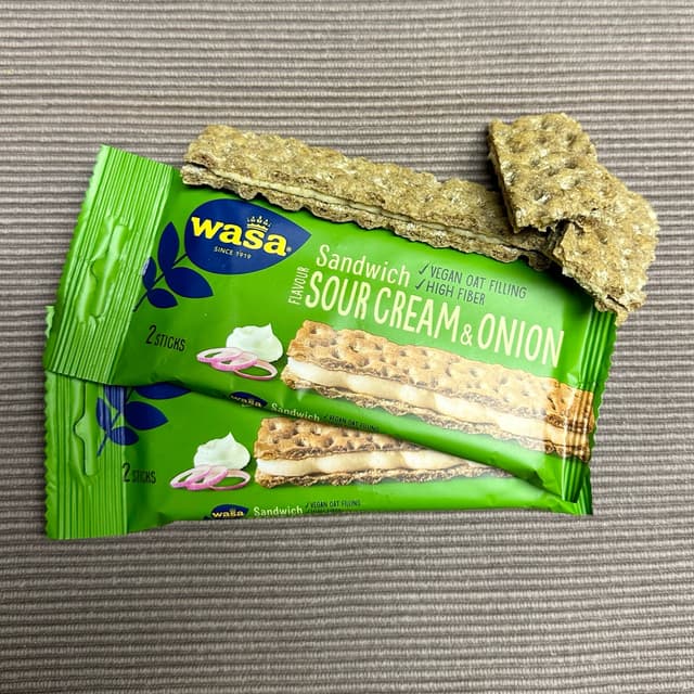 Crispbread sandwich with an oat based #sourcream and #onion cream cheese filling. Each pack contains two sticks. The #crispbread is very nice, it contains #wholegrain rye and #oat flour so it definitely has that ‘healthy’ bread flavour. They’re very good and crunchy! The filling is.. okay but not the best. It is thick but could be a lot creamier in my opinion. It is also slightly grainy, though you don’t notice a lot of that when eating it with the crispbread. The taste is pretty good, it isn’t a heavy flavour but it’s still nice. I mostly taste the onion, the sourcream part isn’t very prominent. There is a good amount of the filling as well which is a big plus. One pack costs around ~13 NOK but they often go on sale for 10. The price isn’t too bad either way. I love how convenient and #lazyvegan friendly these are! They are available in most stores and is great on the go as well. Overall they are okay, the filling could use some improvement, though I’m not sure if it is possible to make a shelf-stable #creamcheese perfect.😅 I keep buying them anyway. #sourcreamandonion #onthegosnack #crackers #sandwich