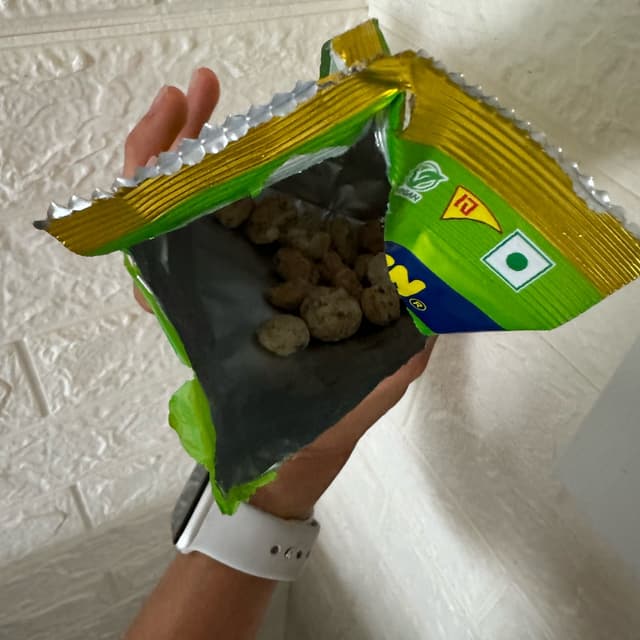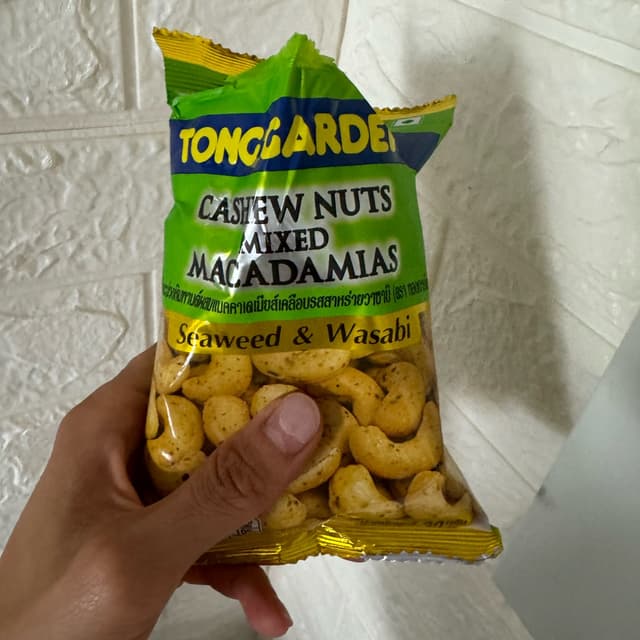 Creamy macadamia with cashews, it isn’t too spicy and is a good savory snack. It looks like a sizeable pack but it’s only… about 1/8 full 😂