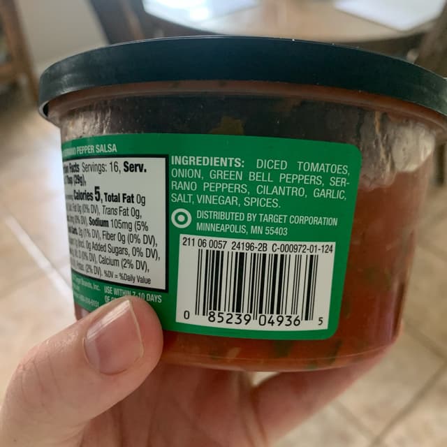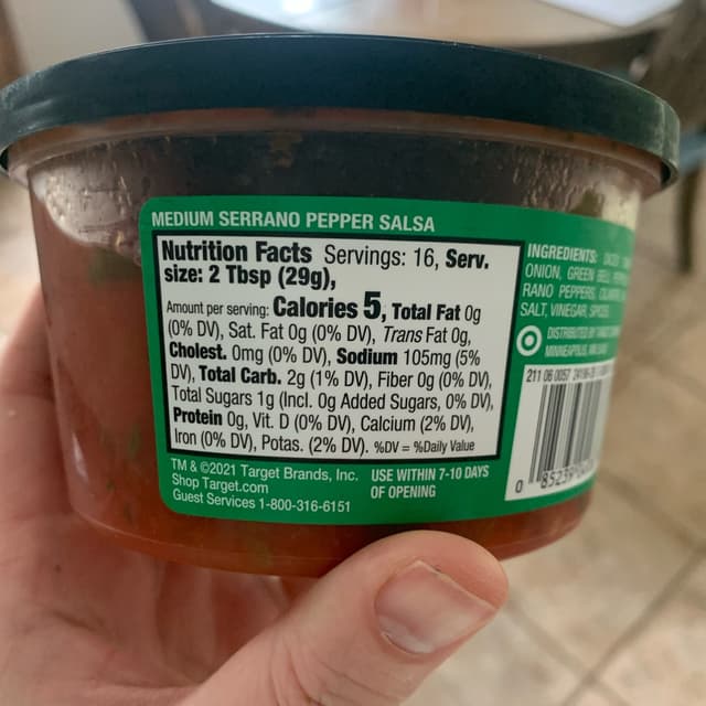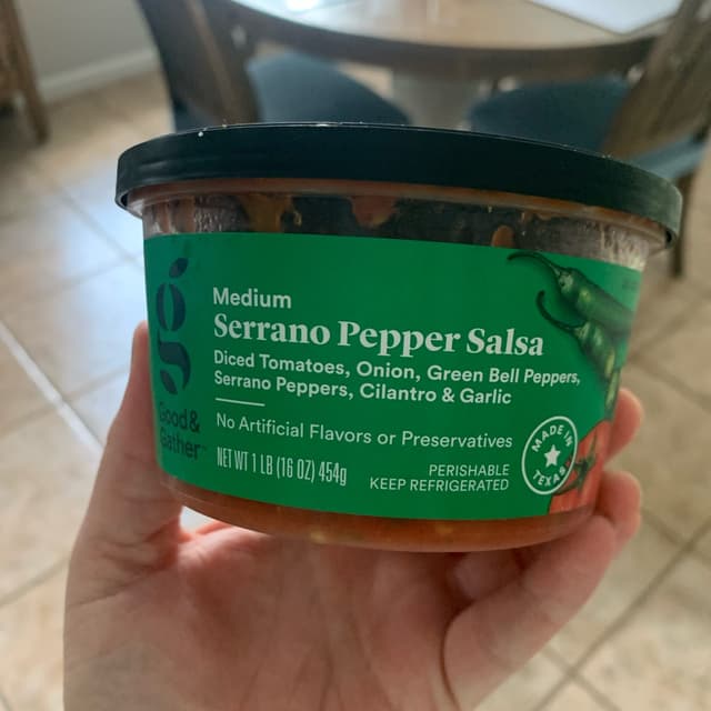 nikkidavisarmstrong3 years agoSee TranslationI’m a fan of the Target brand #goodandgather, but this was the first time I saw this Serrano pepper salsa! It is an absolutely delicious salsa with a bit of heat and very flavorful- you can taste the cilantro and garlic-but not over powering.0