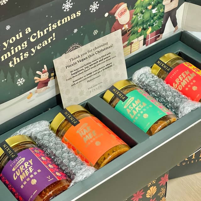 I have been using Pinxin Vegan Chilli and Signature Paste ever they launched. I love how versatile they are, and how quick & easy for us to cook a meal. I have prepared a Fried Rice with Vegan Shredded Un-chicken using their Green Tomyam Paste. No additional seasoning needed, the paste itself is tasty enough. The gift box consists of: Curry Mee x 1 Har Mee x 1 Asam Laksa x 1 Green Tomyam x 1