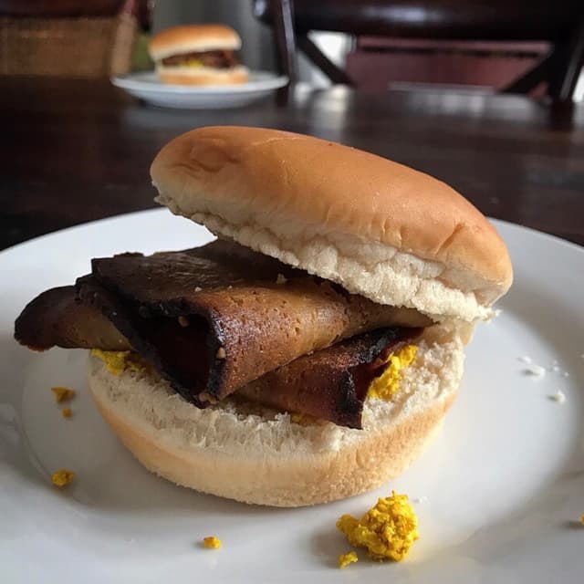 I don’t have a frame of reference as to what bacon should taste like as I’ve never had the “real” thing. But this tastes how I imagine it would tasty. Smoky, with a bit of chew. Good on sandwiches or burgers. #bacon #macon #mockmeat #veganbacon